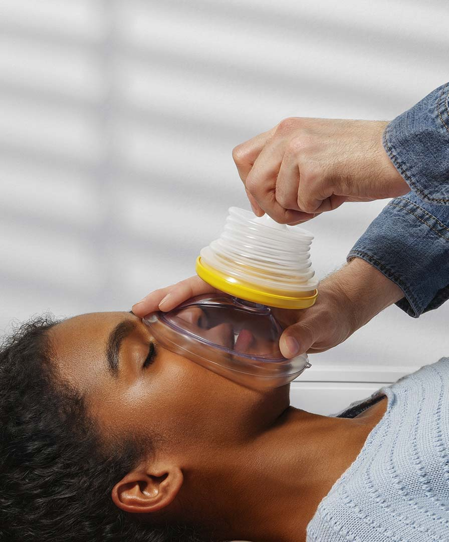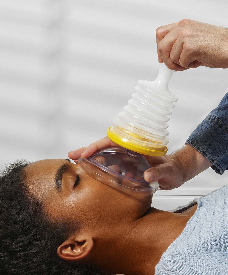 Place the mask over your mouth and nose, and use the handle to create suction until the obstruction is cleared.