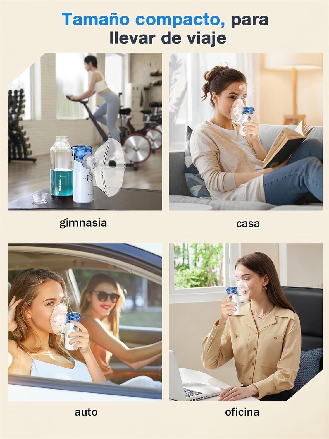 Lleva el nebulizador en tu bolso y úsalo donde lo necesites. Su tamaño compacto y diseño fácil de usar lo hacen perfecto para mujeres activas que desean mantener su bienestar sin interrumpir su rutina diaria.